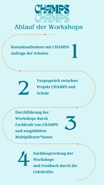 Im Rahmen von „CHAMPS“ bieten wir Workshops an Schulen an, in denen Schülerinnen und Schüler zu den Themen unseres Projektes in einen Diskurs treten können. Angeleitet werden die Workshops von unseren Fachkräften und Jugendlichen, die das Projekt erfolgreich beendet haben und ihr Wissen als Multiplikator*innen an die Klassen weitergeben.